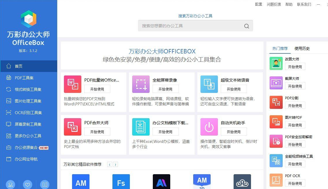 万彩办公大师OfficeBox是一款由广州万彩信息技术有限公司研发的免费办公工具软件超级套装,几乎可以满足日常各种办公工具需求。它内置了60多款强大的,无任何广告及插件的绿色办公组件。所有的套装工具不需要安装,直接可以绿色加载启动,省去了用户为安装各种办公软件而寻找工具、安装及卸载的麻烦。